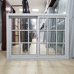 Ventana amplia con perfiles blancos y cuadrículas integradas, ideal para espacios exteriores o fachadas ventiladas, combinando estética clásica y modernidad.